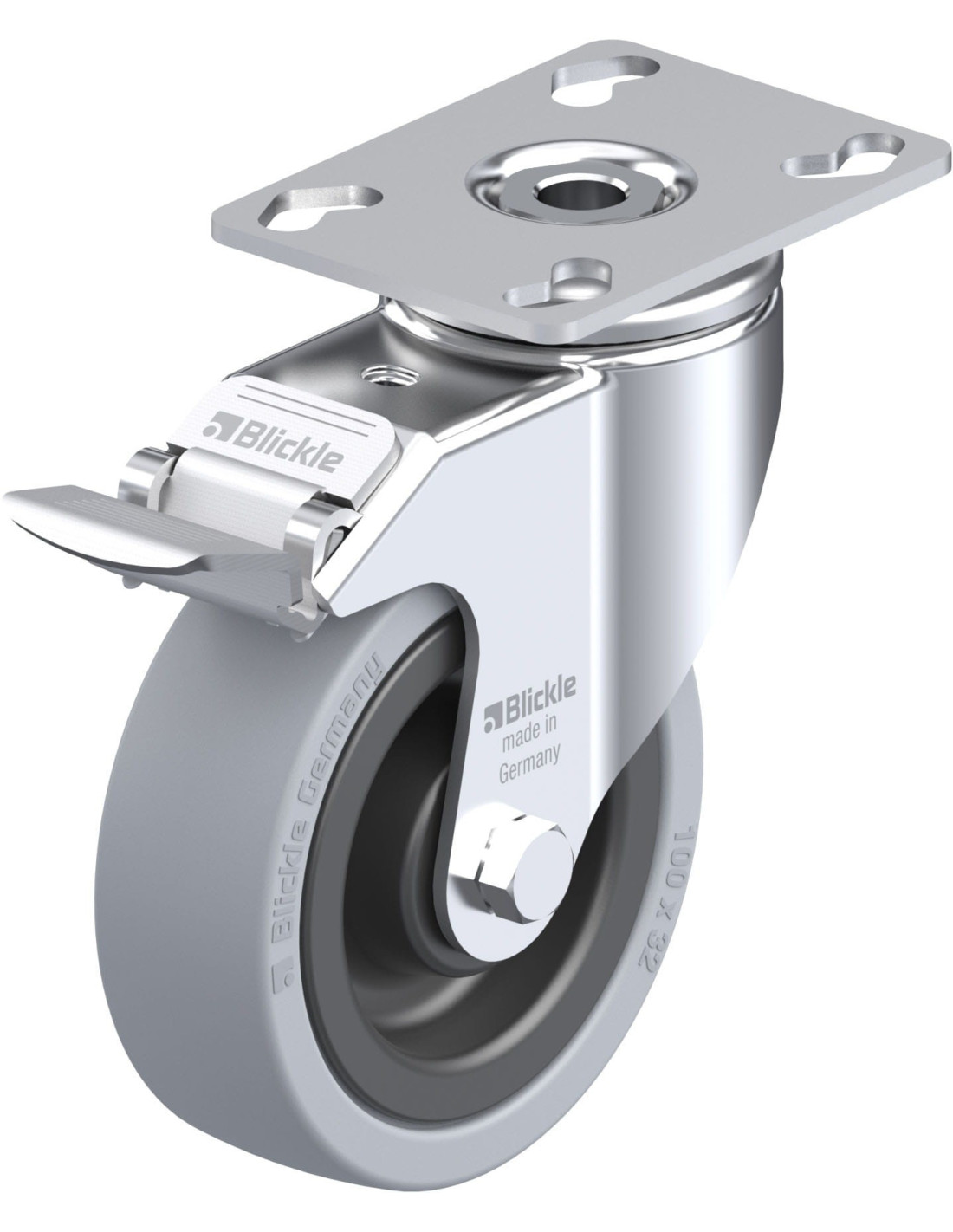 Šis pasukamas ratukas su stabdžiais turi 100 mm gumos ratą ir gali pakelti iki 110 kg. Jis skirtas lengvoms apkrovoms.