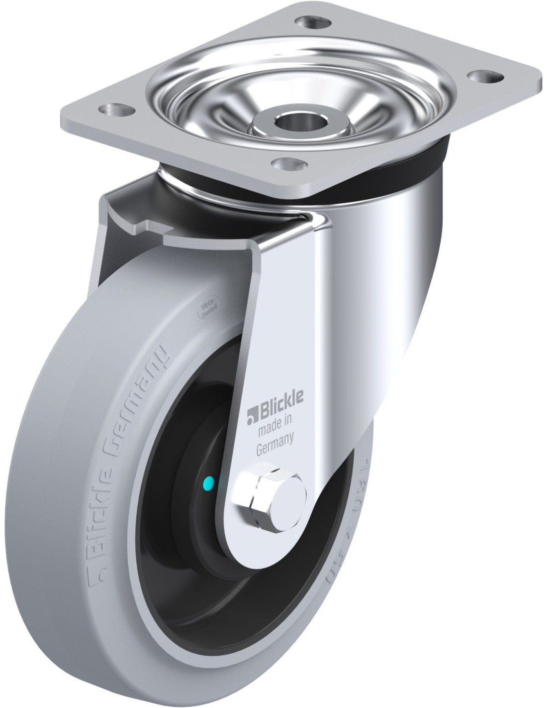 - padanga: aukštos kokybės elastinga kietoji guma „Blickle EasyRoll“, užtikrinanti sklandaus riedėjimo kokybę, kietumas 65 Shore A, spalva pilka, nepalieka žymių