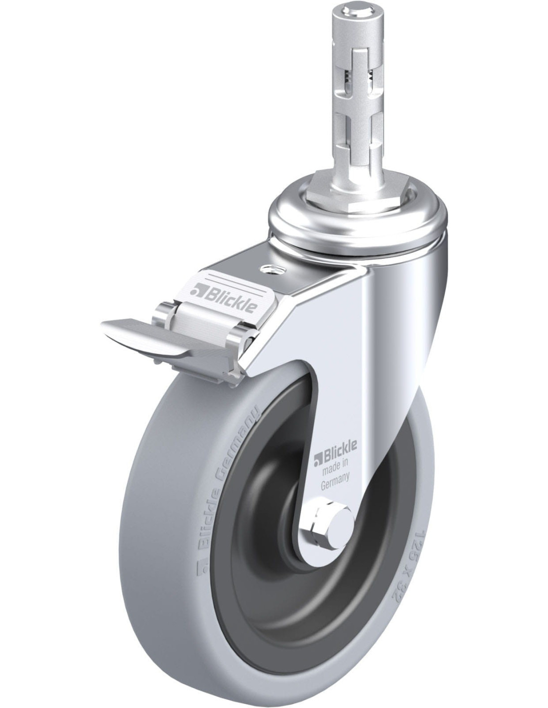 Šis 125 mm guminis pasukamas ratukas su stabdžiais neša iki 120 kg apkrovą, turi rutulinį guolį ir nailoninį centrą, skirtas lengvoms apkrovoms.