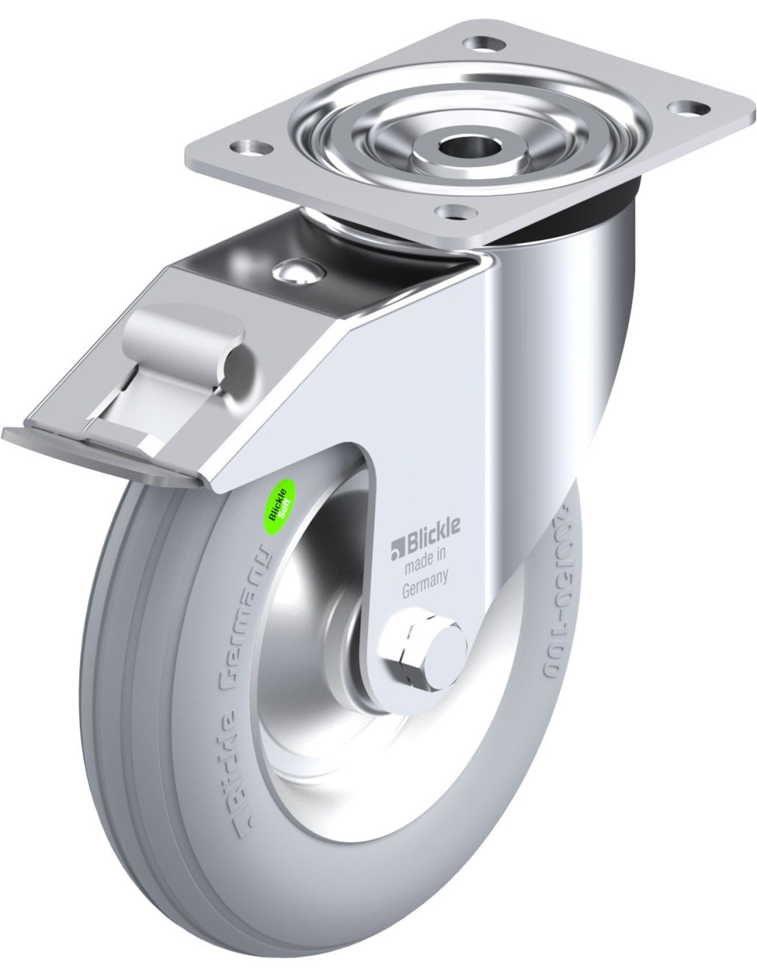 Šis pasukamas ratukas su stabdžiais turi minkštą gumos padangą, kuri nepalieka žymių, ir adatinį guolį su presuotu plieno centru, užtikrinančiu ilgą tarnavimo laiką.