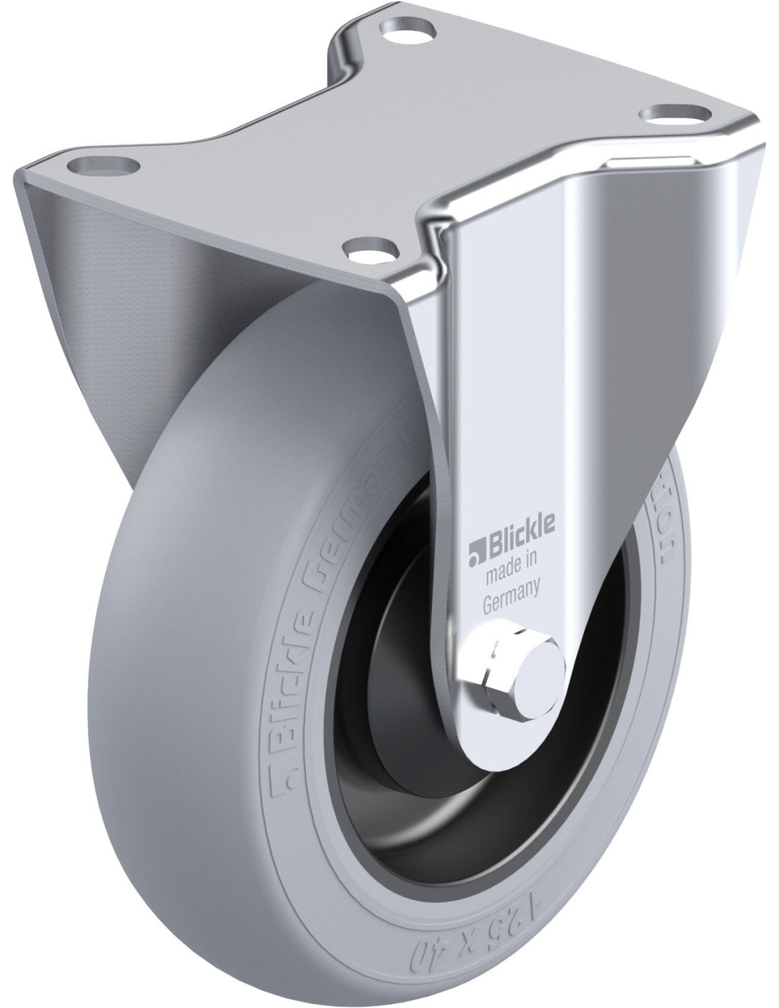 - padanga: aukštos kokybės elastinga kietoji guma „Blickle SoftMotion“, kietumas 55 Shore A, spalva pilka, nepalieka žymių